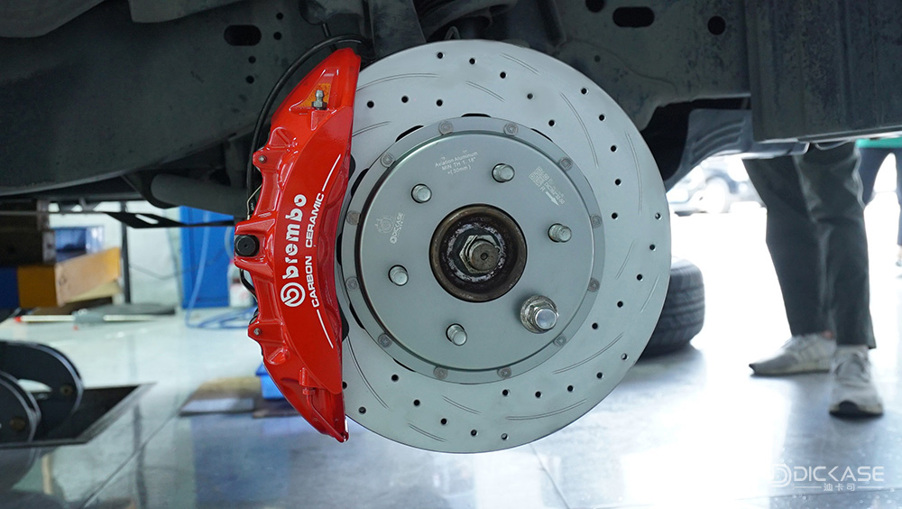 但原車輪轂18寸,原車四活塞剎車卡鉗,剎車腳感偏軟,操控性能較弱。直升布雷博V6六活塞卡鉗,配DICASE362mm剎車盤,制動提升,完颯剎車。